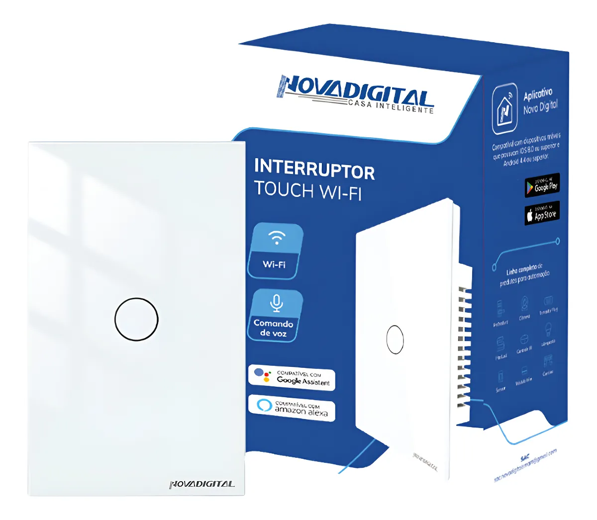 Ilumine sua casa de maneira inteligente com o interruptor touch WiFi. Controle por aplicativo de smartphone de qualquer lugar, com comandos de voz dos assistentes virtuais Alexa e Google, ou através do botão touch do próprio interruptor.